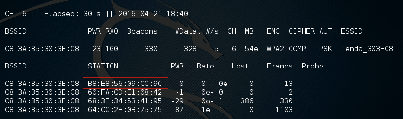 aireplay-ng的生效前提是,wifi网络中至少有一个连接的设备。从上图(4)可以看到哪些设备连接到了wifi,STATION就是连接设备的MAC地址,记住一个。